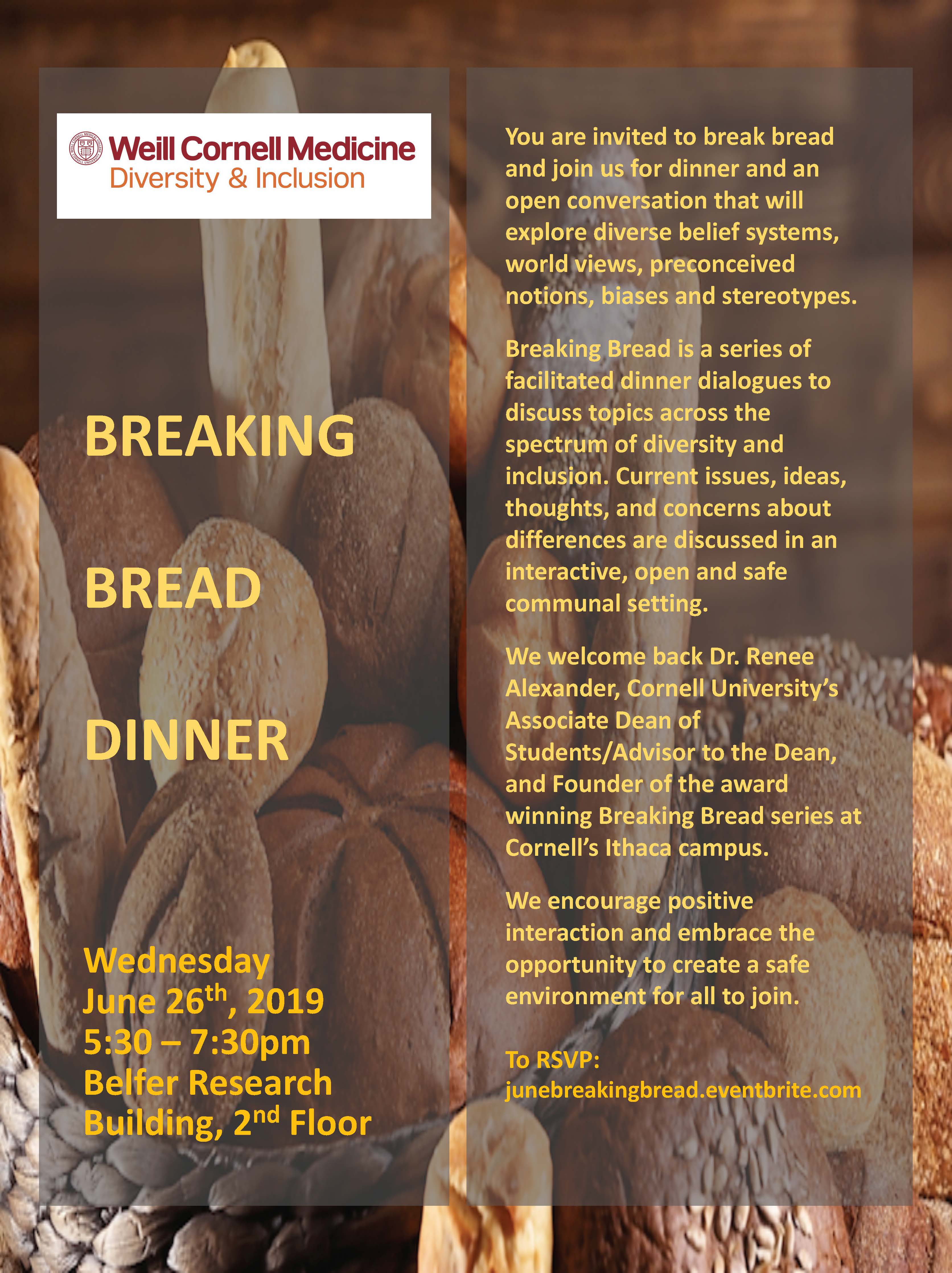 Breaking Bread is a series of facilitated dinner dialogues to discuss topics across the spectrum of diversity and inclusion. Current issues, ideas, thoughts, and concerns about differences are discussed in an interactive, open and safe communal setting.